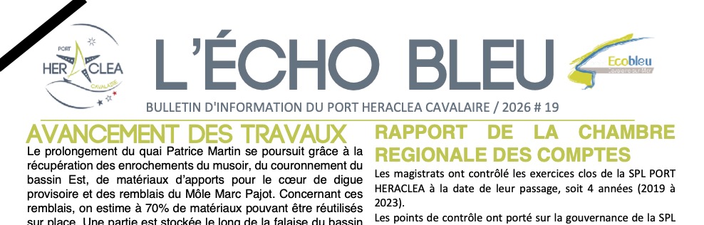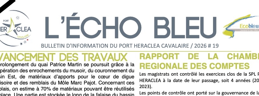 Vous pouvez télécharger L’Echo Bleu n°19 Mars 2026 , notre lettre d’informations à destination des plaisanciers et usagers du Port Heraclea de Cavalaire.